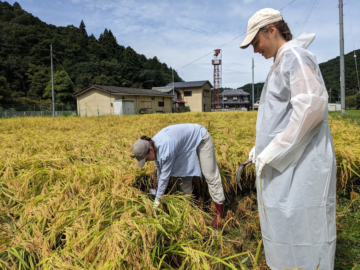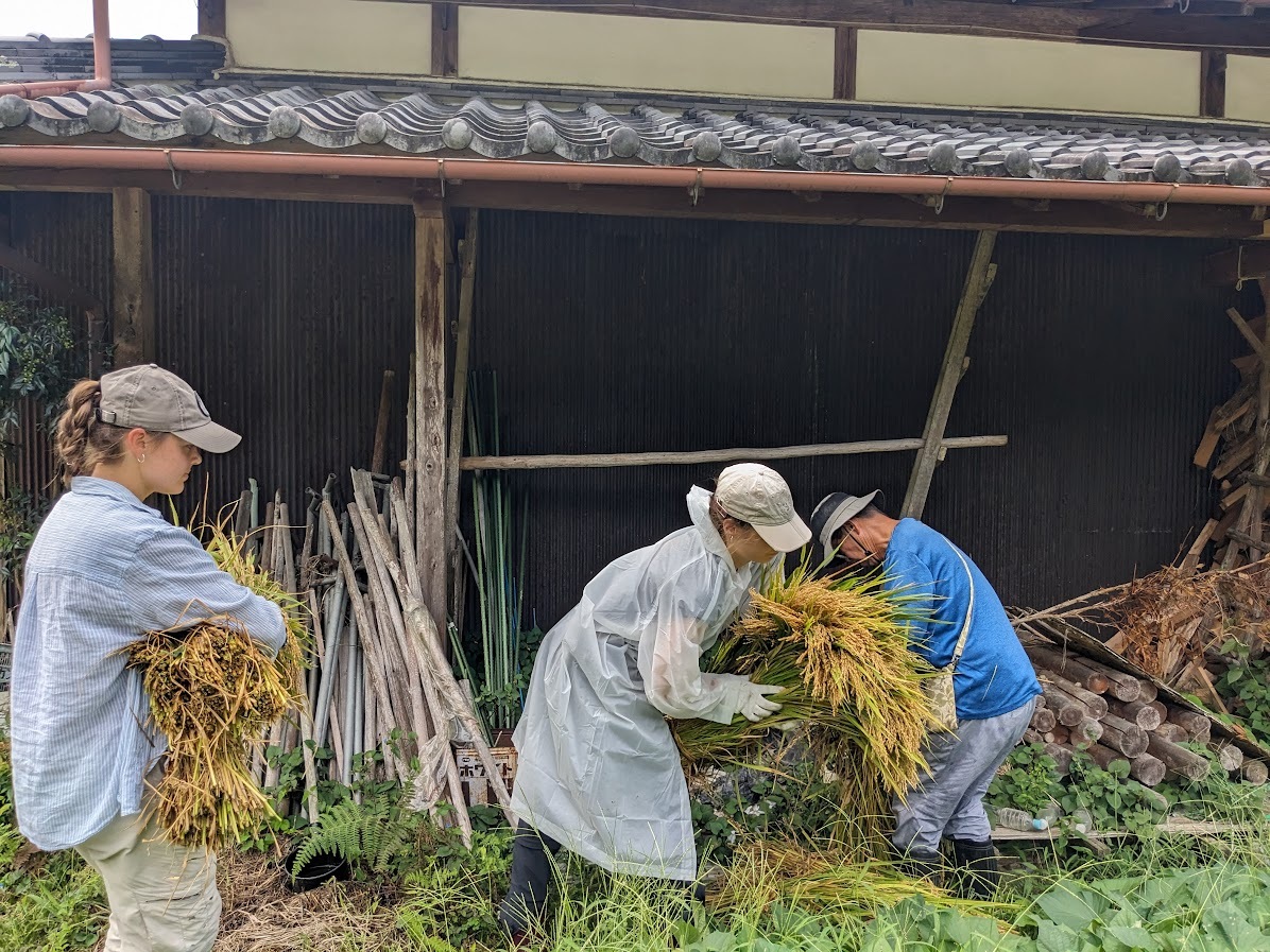 Autumn is the rice harvesting season in the Yamato-Asuka area. Our very friendly German visitors tried the traditional way of harvesting rice, helping local farmers. It was quite hard work on a humid day, but we were lucky enough to finish without being rained out.