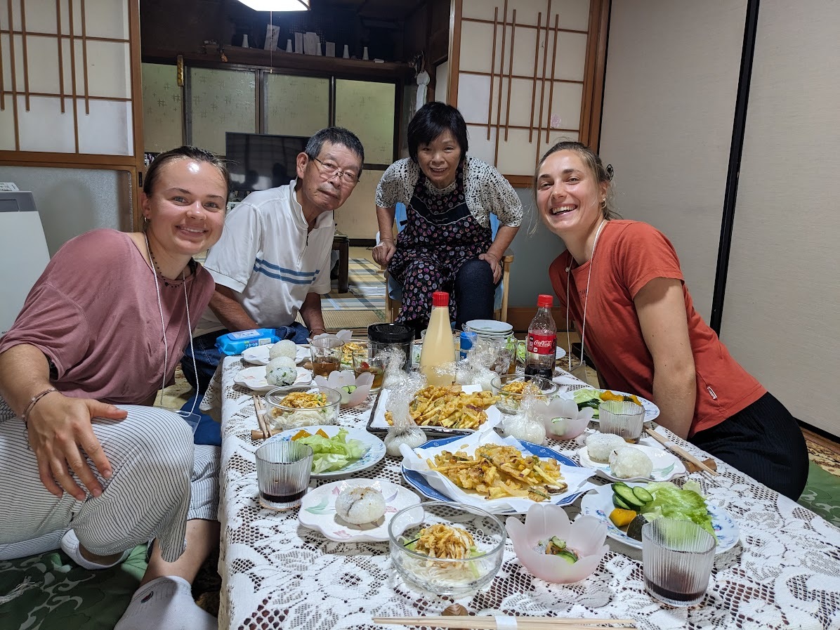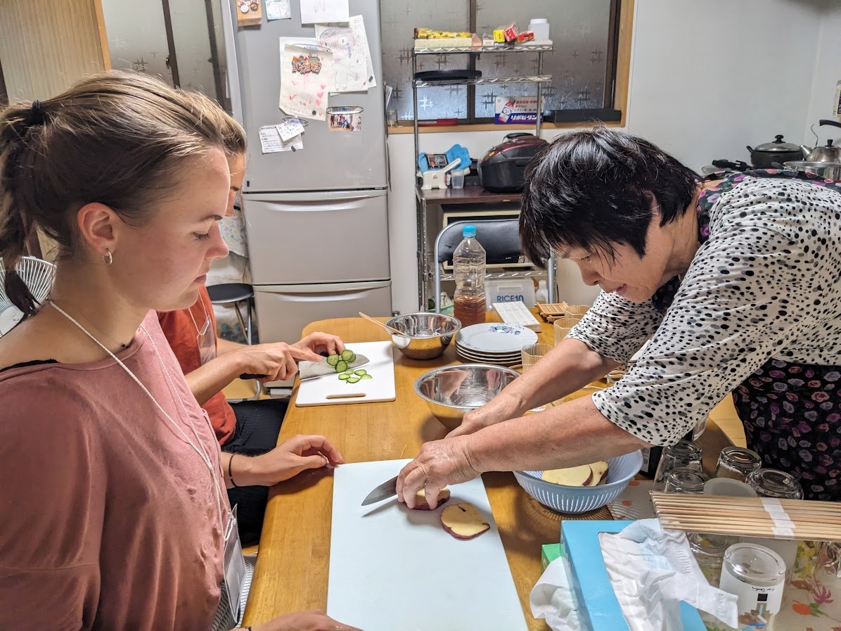 The farmers’ vegetarian meal was delicious—a great combination of tempura, cooked and raw vegetables—served with our locally grown rice. We even made our own onigiri (rice balls)! Seasonal fruit was served for dessert, along with chilled Japanese tea.