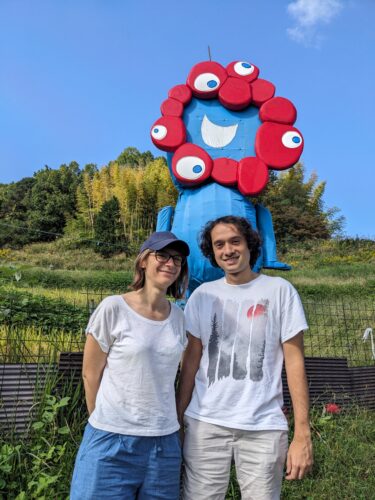 Before meeting the host family, we introduced them to Miyaku Miyaku, the official character of EXPO 2025 Osaka, Kansai, which was made by the local NPO as this year’s Big Scarecrow of Inabuchi Rice Terraces in Asuka.